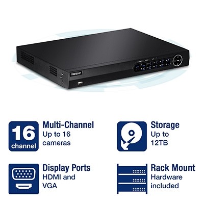 ضبط ویدئو از 16 کانال دوربینمدیریت تا 16 دوربین TRENDnet ضبط همزمان ویدئو 1080 پیکسلی برای هر کانالقابلیت نصب دو هارد 3.5 "SATA II و پشتیبانی ازبیش از 12 TB ذخیره سازی (HDD ها را شامل نمی شود) بازنواخت پیشرفته ویدیوقابل نصب در رکپشتیبانی از پروتکل ONVIF